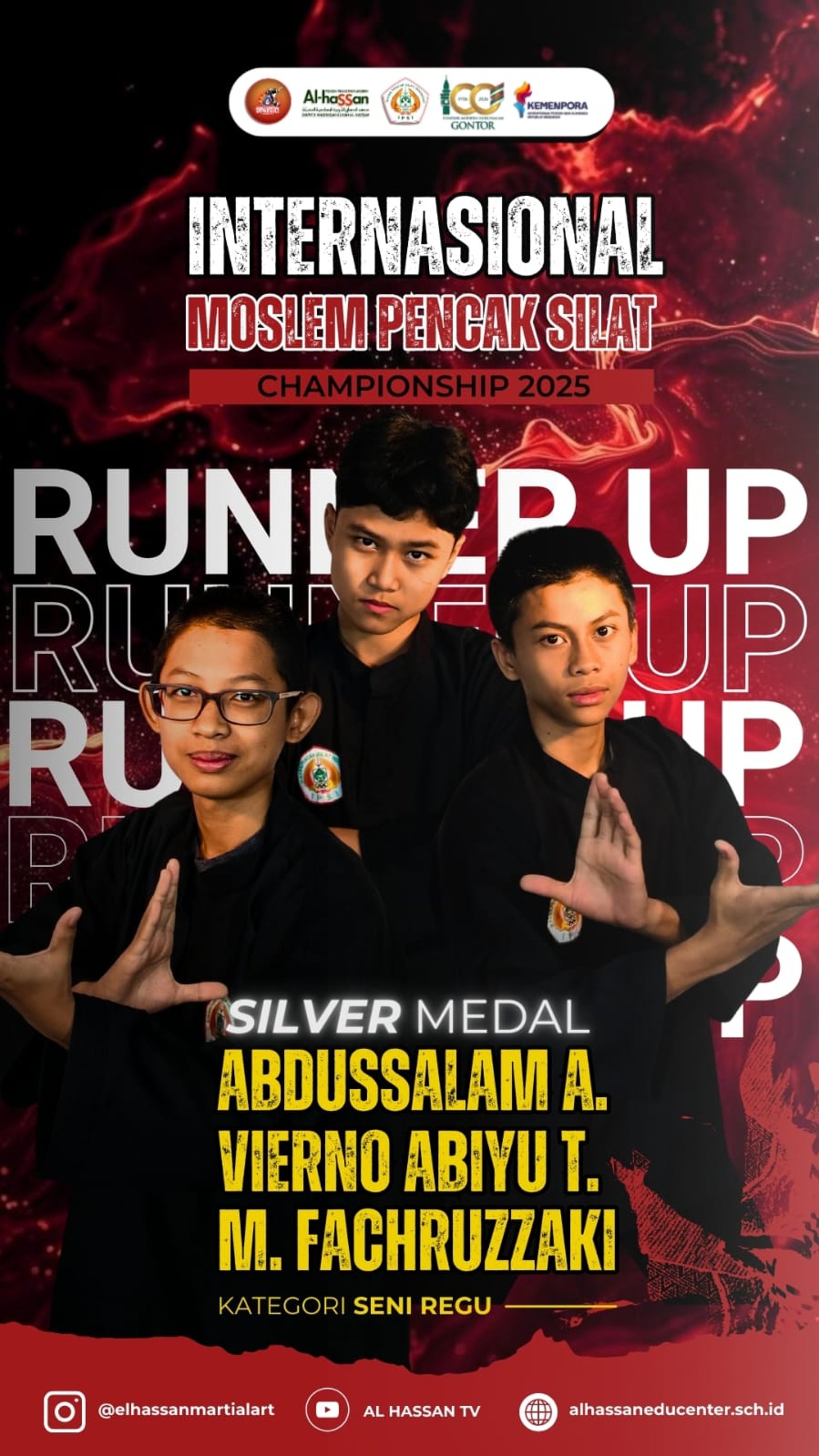 Alhamdulillah, tim pencak silat Pondok Pesantren Modern Al-Hassan berhasil meraih Silver Medal (Runner Up) pada ajang Internasional Moslem Pencak Silat Championship 2025 🥈✨ 📌 Kategori: Seni Regu Abdussalam Almuqorrobin (Kelas 11) Vierno Abiyu Tumular (Kelas 11) M. Fachruzzaki Azhar (Kelas 10) Prestasi ini menjadi bukti semangat, kerja keras, dan dedikasi para santri dalam mengharumkan nama pesantren di kancah internasional. Teruslah berjuang dan jadilah inspirasi! 🔥 #alhassan #IMPSC2025 #pencaksilat #prestasisantri